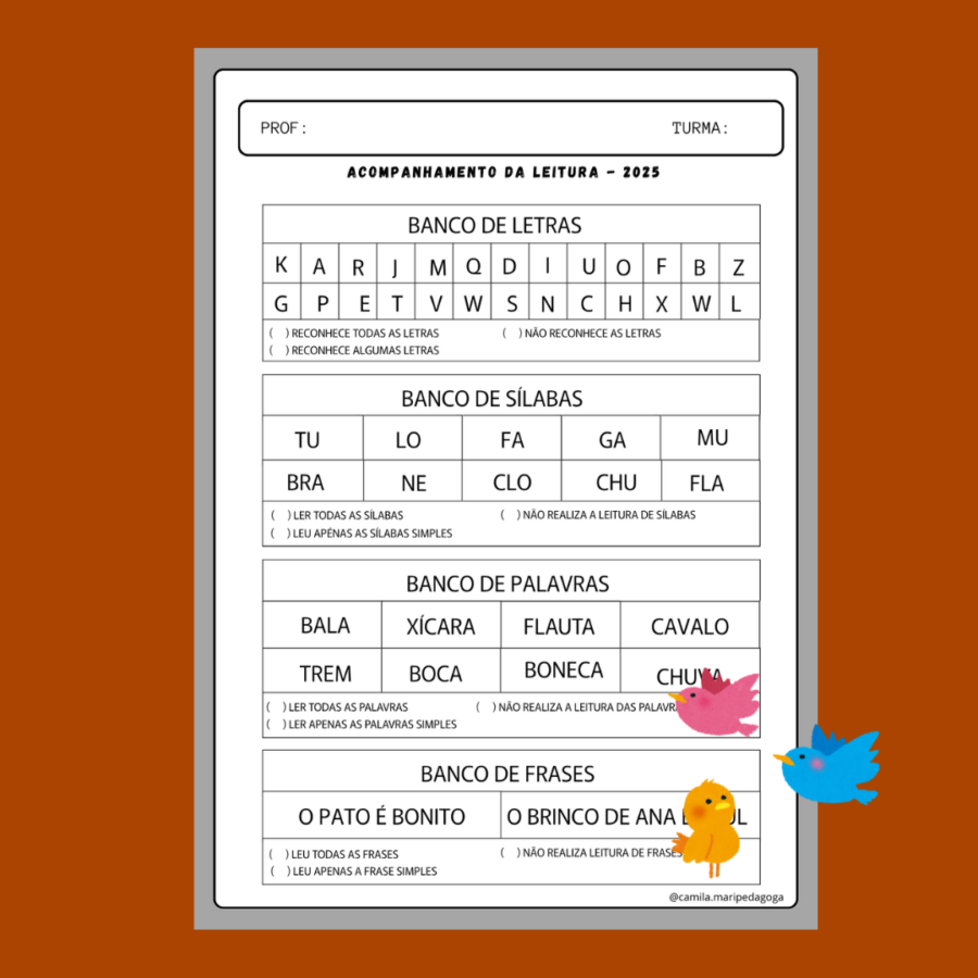 – Fichas de leitura (sílabas simples e complexas, palavras simples e complexas e frases simples e complexas);